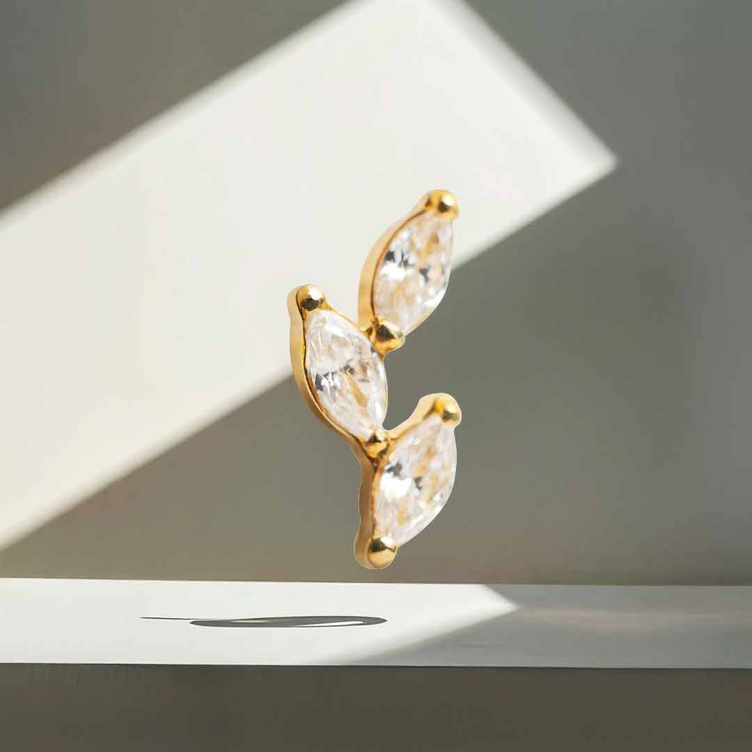 El modelo incluye rosca interna, lo que facilita la colocación y protege el tejido. Además, cuenta con un grosor estándar de 16G (1.2 mm), perfecto para diferentes perforaciones. Sus cristales cz ofrecen un destello brillante que realza la forma de espiga.