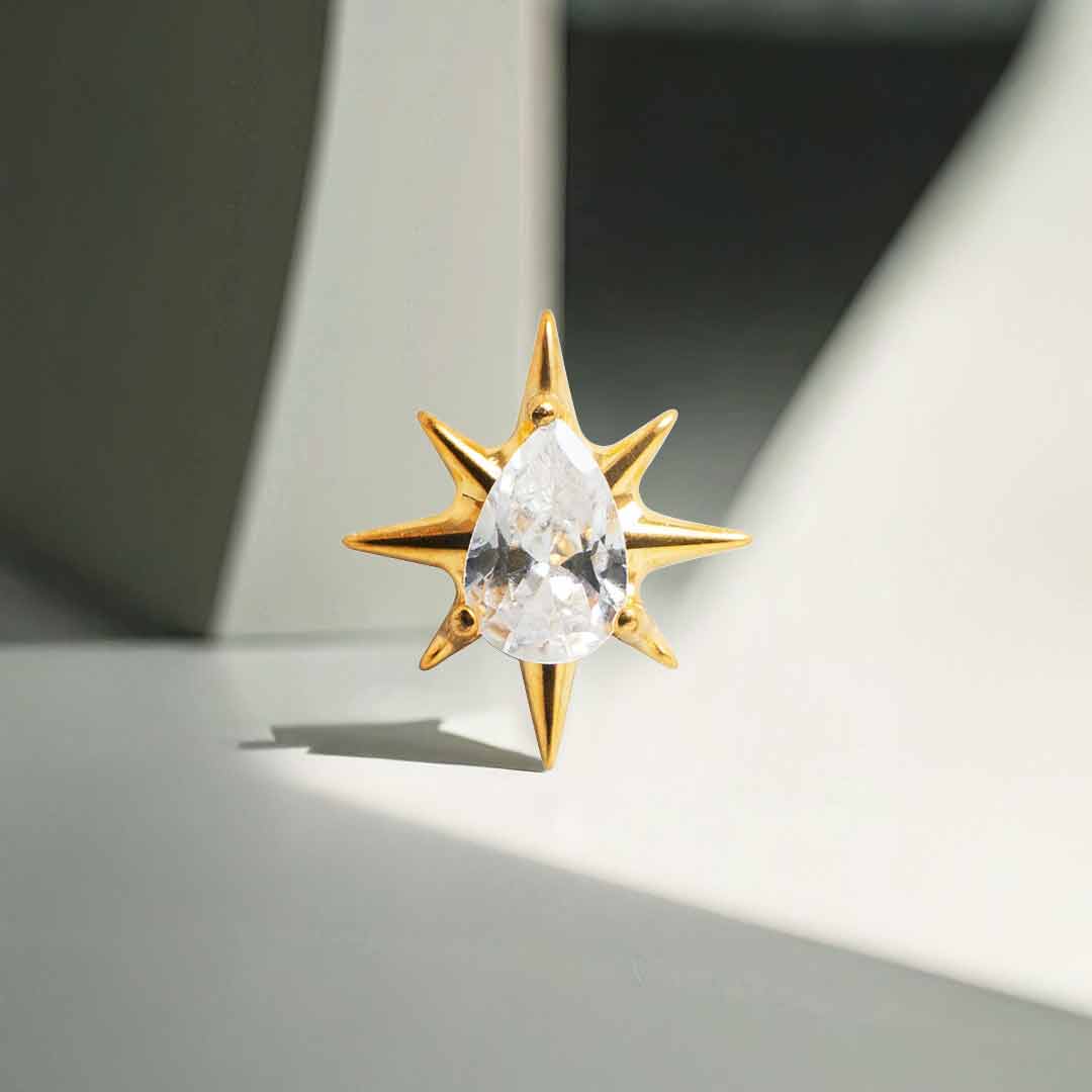 El piercing incluye rosca interna, lo que facilita la colocación y protege el tejido de la perforación. Además, cuenta con un grosor estándar de 16G (1.2 mm), cómodo y versátil. El cristal cz aporta un destello brillante que realza la forma de estrella con lágrima.