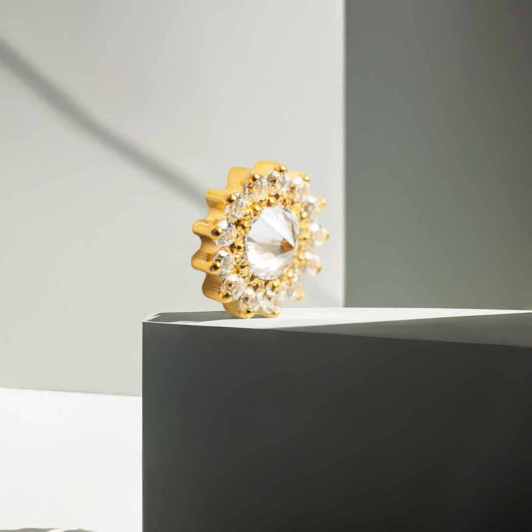 El piercing Flor 5 en oro pvd destaca por su diseño delicado y elegante. Gracias a sus cristales cz, aporta un brillo sutil que ilumina cualquier perforación. Además, su forma floral transmite frescura y un estilo sofisticado.